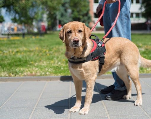 Guide dogs and service animals are generally permitted in public areas, with restrictions on rides for safety reasons.